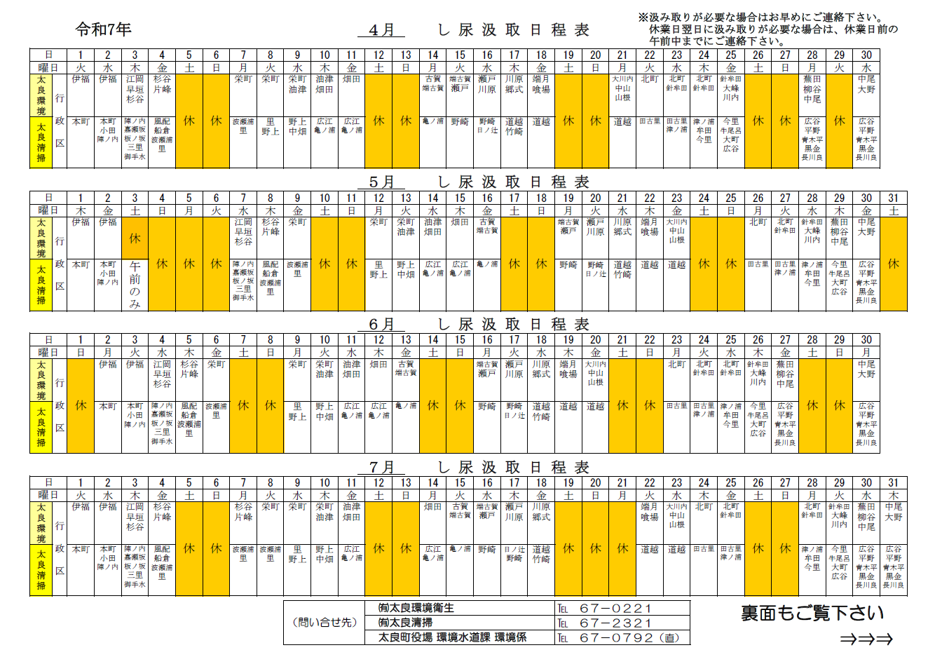 2025年4~7月のし尿汲取り日程表を掲載いたしました。予定日以外での汲取りをご希望の場合はお早めにご連絡ください。その他浄化槽の清掃・管理、ご相談もお気軽にご連絡ください。
