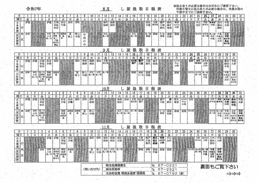 2025年8~11月のし尿汲取り日程表を掲載いたしました。予定日以外での汲取りをご希望の場合はお早めにご連絡ください。その他浄化槽の清掃・管理、ご相談もお気軽にご連絡ください。